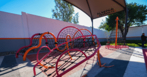 Además, se instaló una lonaria en el patio cívico y en el módulo lúdico, para que las niñas y los niños se diviertan sin exponerse al sol o a la lluvia, así como se colocaron luminarias exteriores, se trabajó la jardinería y las áreas verdes.