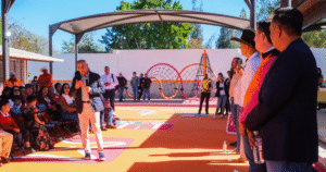 “Hoy agradecemos a todos ustedes que estén aceptando estas instalaciones que son parte de la comunidad. A fin de cuentas, estamos conectando perfectamente lo que es el templo con la plaza, con este bellísimo espacio público también. Estamos entregando algo completamente reconstruido, techos nuevos, pintura nueva, pisos, ventanas, puertas, ingreso, la barda que se estaba cayendo, esta lona, esta canchita”, informó Ontiveros Balcázar.